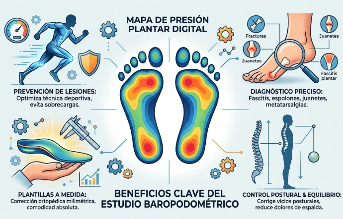 El estudio baropodométrico es un análisis de alta tecnología que permite medir las presiones plantares del pie tanto en posición estática (parado) como dinámica (caminando). A través de una plataforma equipada con miles de sensores digitales, obtenemos un "mapa" preciso de cómo el cuerpo distribuye su peso sobre los pies.